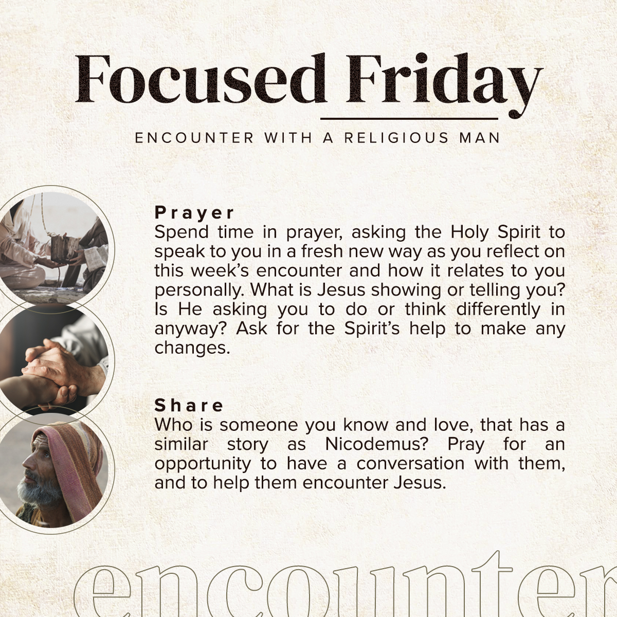 So over the next six weeks, we’re going to look at six of those encounters, with six different kinds of people. See if any of these sound like people you know: An encounter with a religious man. An encounter with a lonely woman. An encounter with a hopeless man. And encounter with a moral failure. An encounter with a grieving family. And an encounter with a powerful man. So we’ll look at each of those encounters, and we’ll see how that moment became a pivot point in each of those lives.
